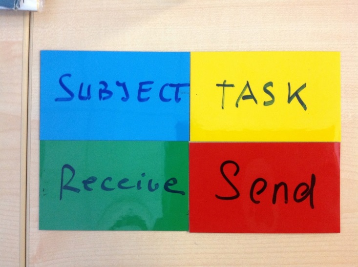 Карточки Задач (желтые), отнесенные к Субъекту (синий) на предыдущем шаге, были перенесены из Диаграммы коммуникаций в область Задач. Каждое сообщение, отображенное на предыдущем шаге стрелками, было преобразовано в Зеленые карточки для Сообщений, которые Субъект получает, и Красные карточки для Сообщений, которые Субъект отправляет другим Субъектам. В ходе дальнейшей работы могут создаваться новые Задачи и Входящие или Исходящие Сообщения. Действия (или их поток) отображаются последовательностью
