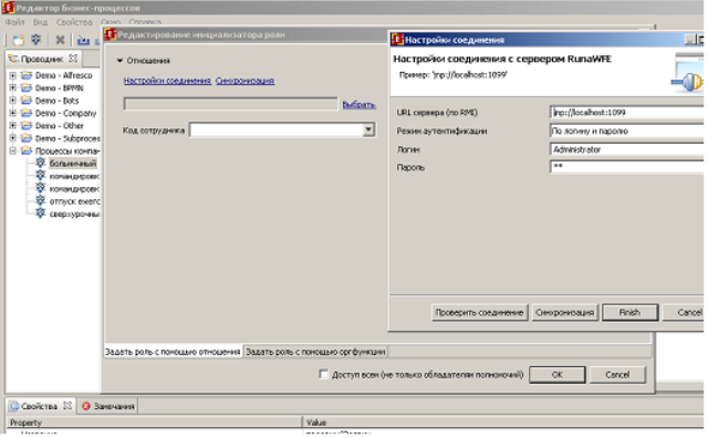 В редакторе в бизнес-процессе при редактировании инициализатора роли можно выбрать закладку «задать роль с помощью отношения». В этом случае можно задать настройки соединения с сервером и импортировать отношения в редактор.