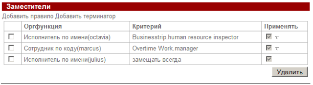 При формировании списка заданий правила замещения, относящиеся к данному пользователю, просматриваются сверху вниз до тех пор, пока либо не будет найдено первое по порядку подходящее правило замещения (в котором выполняется условие в «критерии» и заместитель имеет статус «Активен»), либо будет выяснено, что ни одного подходящего правила нет.