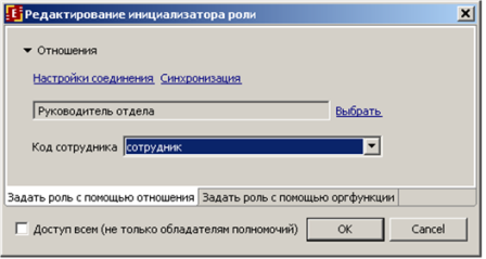Далее отношение можно поставить в соответствие роли. В форме выбирается имя отношения и переменная или константа, соответствующая правой части отношения, задающая пользователя или группу пользователей.