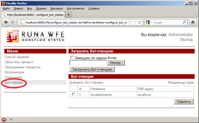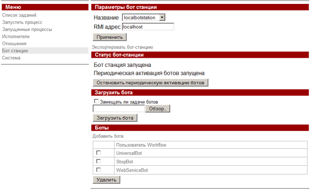 Для работы ботов была разработана специальная среда - бот-станция, организует их взаимодействие с СУБП. Как правило, бот-станция соответствует серверу, на котором размещены боты. Находящиеся в бот-станции боты обращаются к СУБП. Если выполняющиеся на сервере экземпляры бизнес-процессов содержат задачи для ботов, то боты выполняют эти задачи и возвращают результаты работы на сервер.