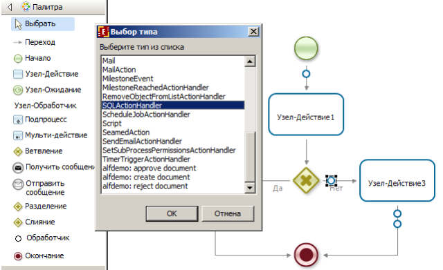 и обработчики на схеме будут скрыты. При этом после загрузки разработанного бизнес-процесса в среду исполнения элементы-обработчики будут выполняться при прохождении через них точек управления.