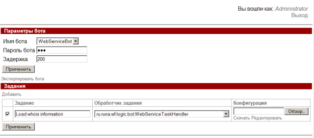 Параметрами бота являются: имя бота (соответствует логину пользователя), пароль бота, список заданий, выполняемых ботом. Список заданий состоит из имени задания, ссылки на обработчик и конфигурации задания.