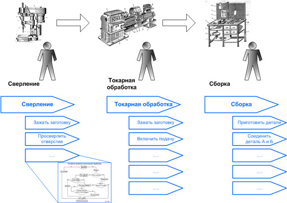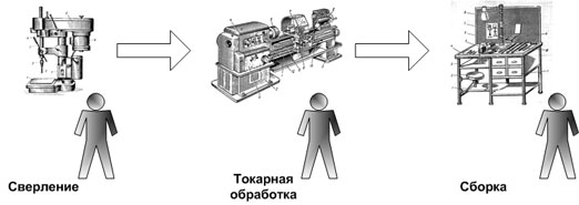 Для понимания ключевых недостатков любой графической схемы давайте рассмотрим простой пример – производство некоторого изделия. Деятельность состоит из 3-х этапов: сверление, токарная обработка и сборка, как показано на рис.1