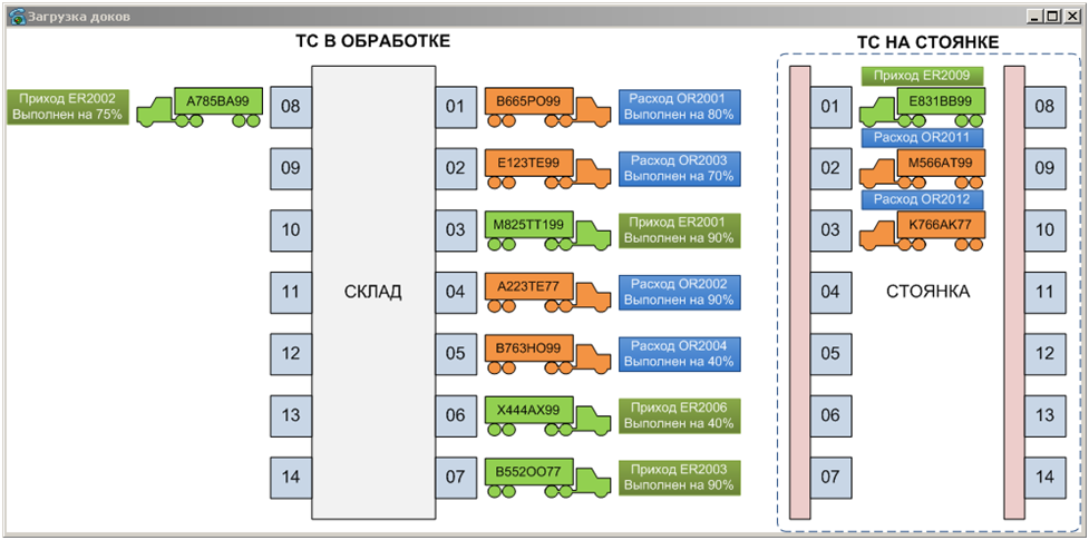 Так, например, по факту прибытия ТС на погрузку, WMS – система анализирует занятость доков отгрузки, наличие мест в очереди на парковку и, исходя из этого, предлагает решение менеджеру управления двором о дальнейших перемещениях ТС по территории складского комплекса, либо об ожидании въезда на территорию. При въезде на территорию печатается пропуск с указанием либо № дока, либо № места на парковке. Пропуск имеет уникальный штрих код, который является средством автоматической фиксации времени въезда на территорию, времени постановки на док, времени убытия с дока и времени убытия с территории склада. Для управления очередью ТС модуль управления двором имеет наглядную графическую отчетность о положении ТС на территории складского комплекса, оперативность которой обеспечивается менеджером управления двором в полуавтоматическом режиме. Форма отчета приведена на рис.7.