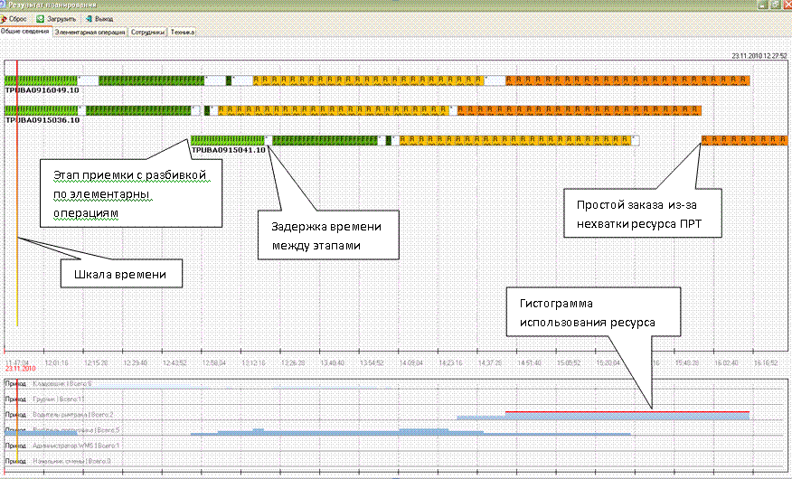 В нижней части экрана располагается окно отображающее занятость людских и технических ресурсов. Такое представление результатов планирования показывает руководителю, во-первых выполнимость обработки имеющихся на входе заказов, и во-вторых в какой момент времени возникнет критическая ситуация по ресурсам.