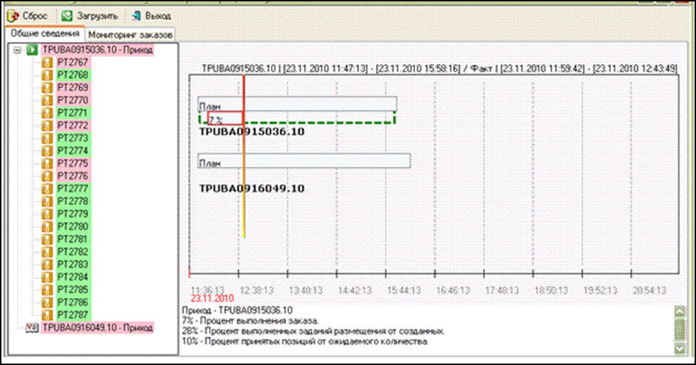 Полученный таким способом план, обеспечивающий выполнение входящего объема работ, является основой для выполнения следующей управленческой операции – операции мониторинга хода выполнения плана. Для мониторинга предусмотрено окно с соответствующим названием (см. рис.6). В данном окне предусмотрено отображение на текущий момент времени процента выполнения плана не только по выполненным заказам, но и по выполняемым в текущий момент времени.