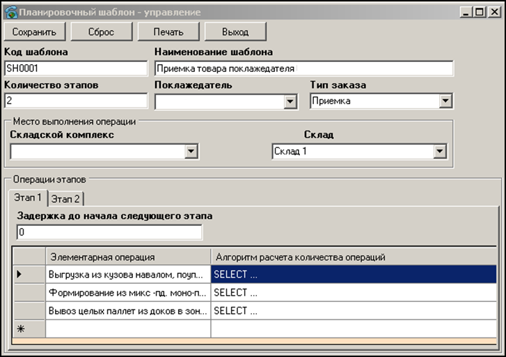 Под Планировочным шаблоном понимается набор элементарных операций, относящихся к разным этапам выполнения работ по заказам поклажедателя (это в случае наличия на складе более одного клиента), обозначенного в шаблоне.