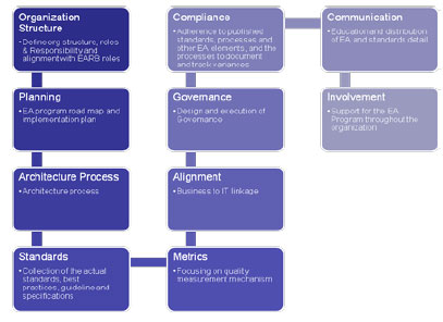 Кроме того, разработка архитектуры организации – непрерывный процесс, который не может быть сразу же осуществлен. Утверждение архитектуры организации имеет критическое значение, потому что создает правила и определения, необходимые для интегрирования информации и услуг в операционный уровень в пределах границ компании. Организация должна упорно работать над формированием и улучшением программы архитектуры до тех пор, пока архитектурные процессы и стандарты не станут второй натурой, а модель и план архитектуры самообновляющимися.