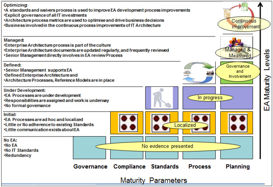 Зрелость в пределах модели архитектуры будет меняться в рамках бизнес-архитектуры, бизнес-процессов, технологической архитектуры и плана архитектуры. Это постоянно эволюционирующий процесс организации, способствующий ее эффективному развитию и поддержке.
