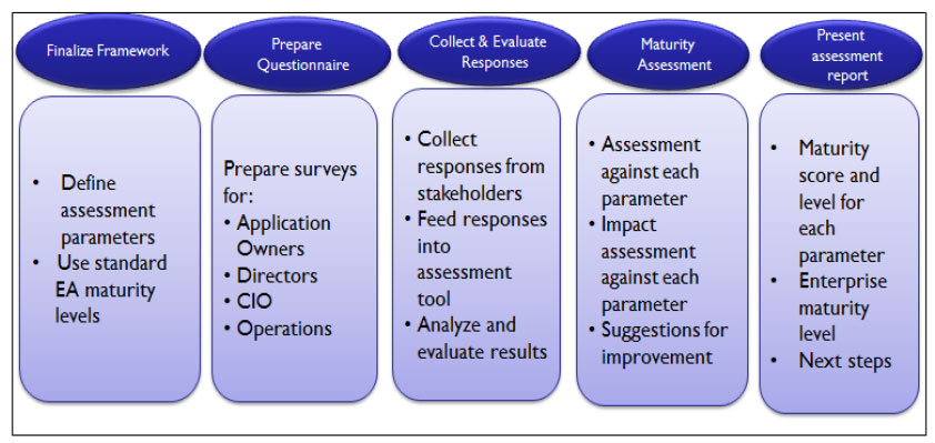 Оценка зрелости архитектуры организации включает модель зрелости с различными уровнями и ряд элементов, подлежащих оценке, а также методологию и инструментарий (анкеты и другие средства). На выходе создается подробный отчет об оценке, который описывает зрелость организации в целом, а также относительно каждого архитектурного элемента.
