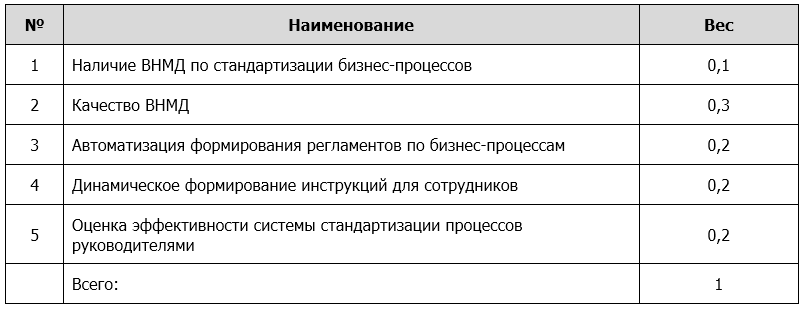 Например, оценка по подразделу «Наличие ВНМД по стандартизации бизнес-процессов» осуществляется при помощи следующей Таблицы 4 (ВНДМ – внутренний нормативно-методический документ компании – регламент, положение, инструкция).