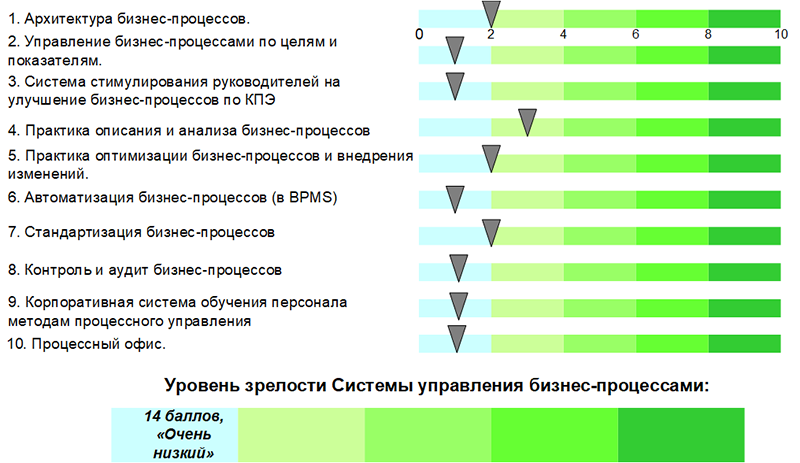 Оценка СУБП проводится по десяти направлениям, которые представлены в списке ниже. Почему именно они? Структуру СУБП компании можно рассматривать по-разному. За годы работы в области процессного управления я пришел именно к такой структуре и использую ее в своей практической работе (консалтинг по построению СУБП в компаниях):