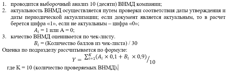Стоит отметить, что в данном случае уже имеет место некоторая субъективность. Что значит «фрагментарный стандарт»? Для меня это понятно – в нем отсутствуют или плохо проработаны необходимые фазы управления жизненным циклом ВНМД компании. Например, не описаны требования по вводу ВНДМ в действие и т.д. Для проведения оценки по данному критерию необходимо использовать соответствующий чек-лист. Еще пример. Оценка по подразделу «Качество ВНМД» осуществляется следующим образом: