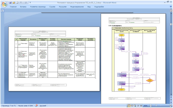 Графическая схема процесса представлена в кросс-функциональном виде. Объем регламента процесса управления в целом составил для процесса «Управления ТО» около 70 страниц в MS Word, что немного для такого значительного количества процессов.