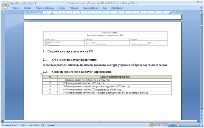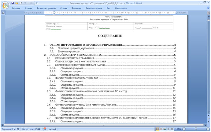 Отчет, запущенный для объекта модели «Управление ТО» сгенерировал документ в MS Word и вывел всю информацию о контурах и процессах управления в нужном формате. Автоматически было получено содержание документа (см. рис. 4.).