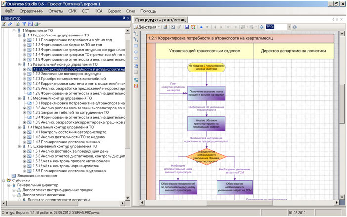 На рис. 1. показана структура процессов управления, разработанная в рамках проекта, участником которого являлся автор статьи. Рассмотрен процесс управления Транспортным отделом торговой компании «Оптима»*, г. Ижевск. Описание процессов выполнено в среде моделирования Business Studio 3.5.