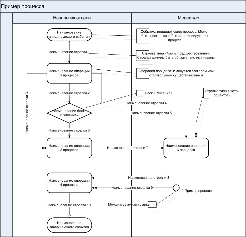 В нотации «Процедура» используются простые условные обозначения. Так для стрелки типа «связь предшествования» («Sequence Flow» в BPMN) используется стрелка с одним наконечником. Для связи типа «поток объектов» («Message Flow» в BPMN) – стрелки с двумя наконечниками. Начало и конец стрелки могут быть либо темными, либо светлыми, пустыми. Таким образом, можно показывать туннелирование стрелок, что практически удобно.