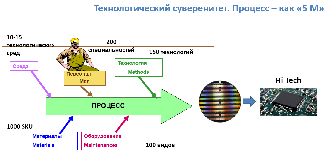 Теперь рассмотрим возможности и условия достижения технологического суверенитета в современной России. Сегодня уровень технологии, как правило, определяет микроэлектроника. Для того, чтобы произвести интегральные микросхемы по технологическим процессам современного уровня, необходимы сотни технологий и специальностей десятки видов прецизионного оборудования, тысячи видов особо чистых (ОСЧ) материалов (газы, жидкости, сложные органические и неорганические соединения), включая монокристаллический кремний со строго дозированными примесями и минимальным разбросом параметров.