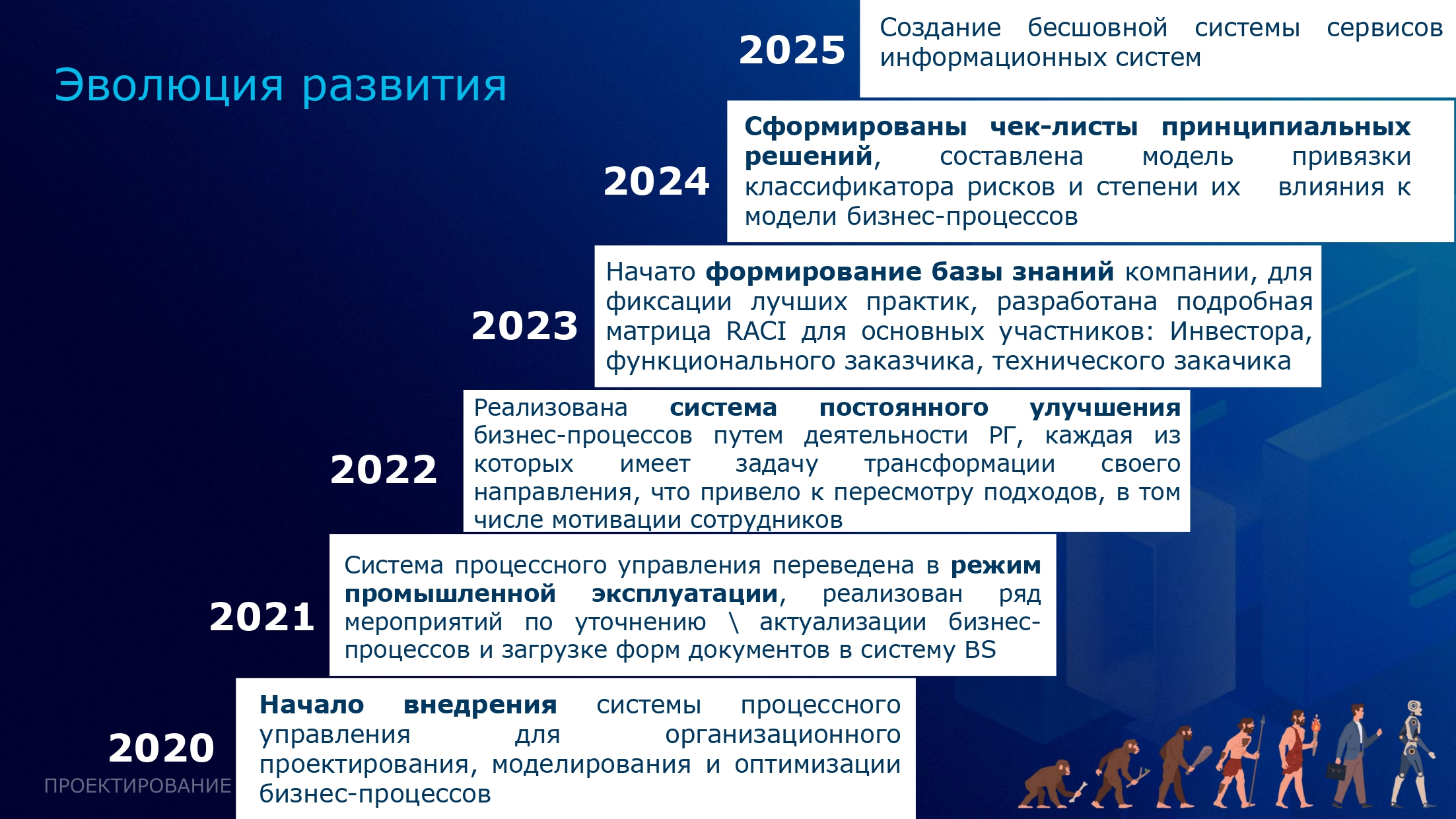 - В 2023 году началось формирование базы знаний для фиксации в ней наших типовых решений и лучших практик. Для основных участников процессов мы разработали подробную матрицу RACI .
