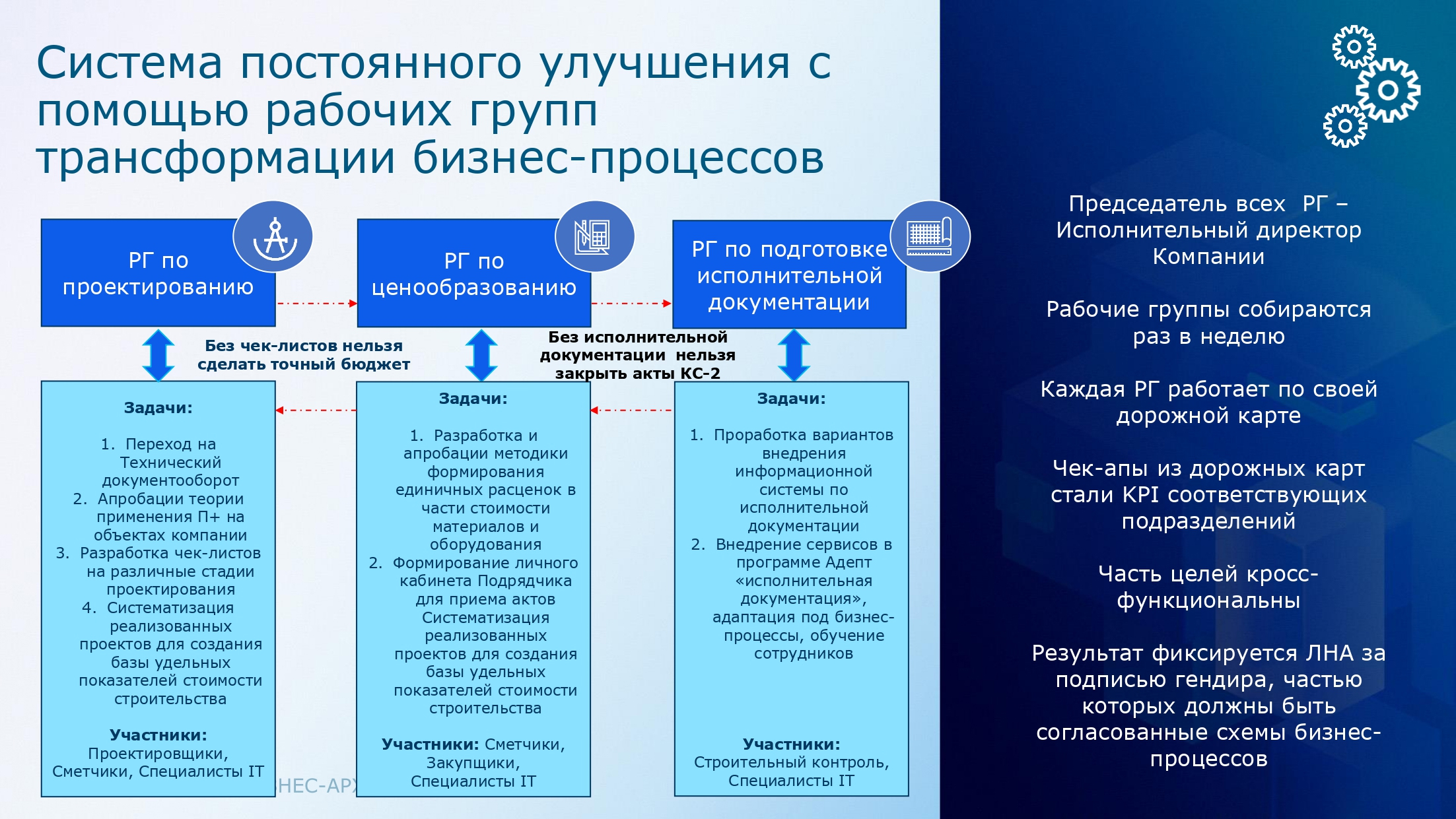 Реализована с помощью рабочих групп, которых в настоящий момент выделено три: «По улучшению проектирования», «По улучшению ценообразования» и «По подготовке исполнительной документации». Все они связаны между собой кросс-диагональными взаимосвязями и перекрестным членством.
