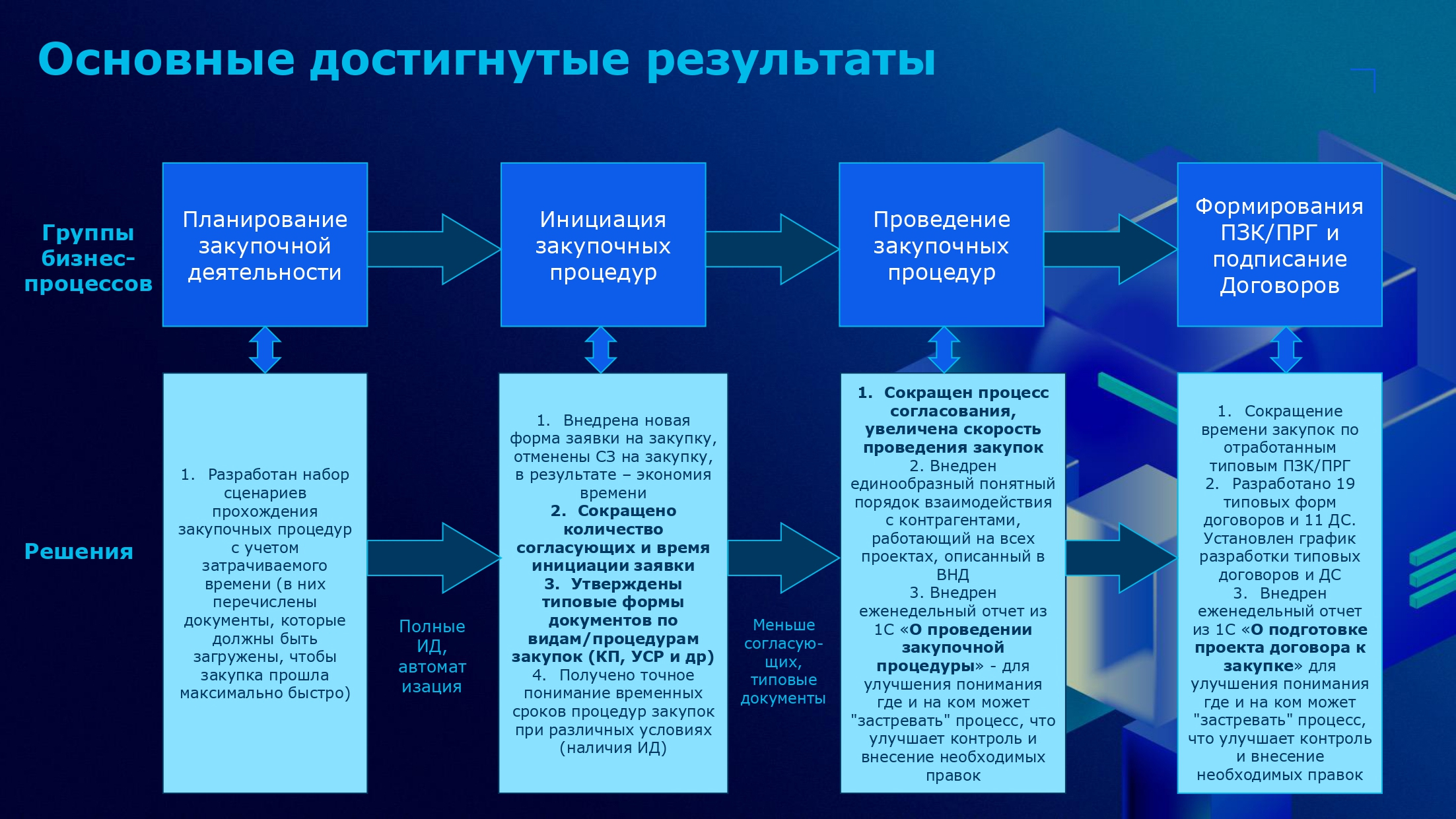 - Изучение рынка, поиск и внедрение оптимальных по стоимости и функционалу технических решений, формирование объективных исходных данных помогли сохранить качество закупок.