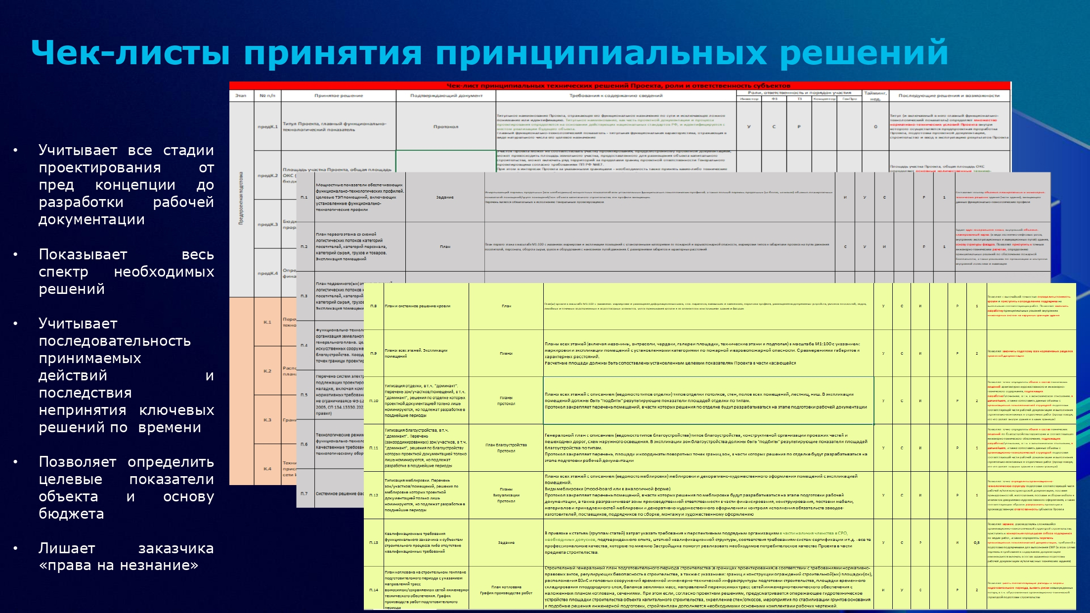 Выходом стала разработка чек-листа принципиальных решений. Он сформирован с разной степенью детализации для таких стадий проекта, как «Предконцепция», «Концепция», «Разработка проектной документации», «Разработка рабочей документации». К нему также добавили матрицу ответственности для основных участников проекта с кратким описанием последствий каждого этапа: что может произойти, если его не заполнить.
