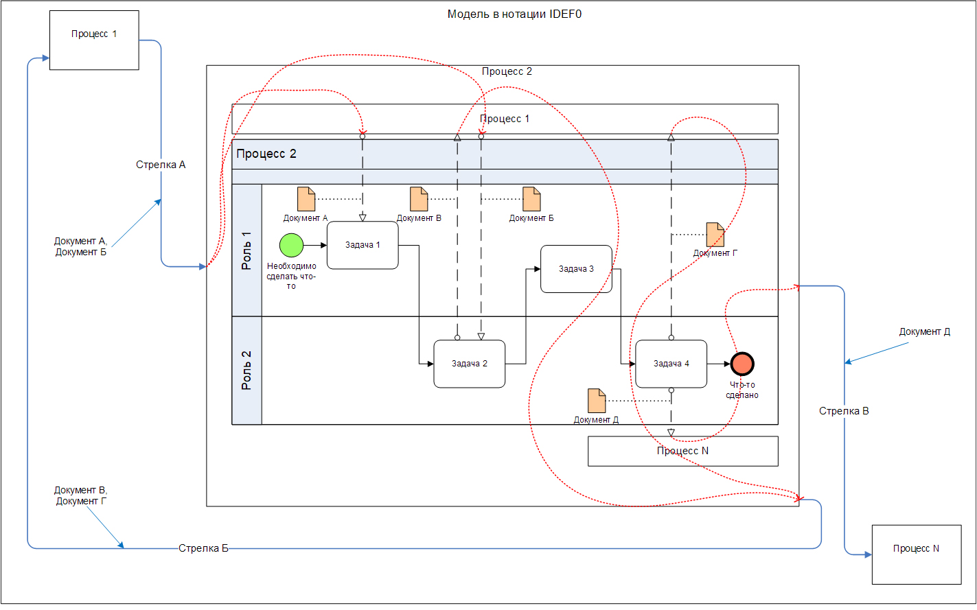 Отмечу, что использование стрелок типа Message Flow на модели в BPMN, в общем случае, не означает, что «Процесс 1» запускает на исполнение «Процесс 2». Так же и «Процесс N» не обязательно стартует сразу после получения «Документа Д» из «Задачи 4». Кстати, «Процесс 1» и «Процесс 2» могут быть связаны между собой (синхронизированы) через обмен данными в конкретной информационной системе.