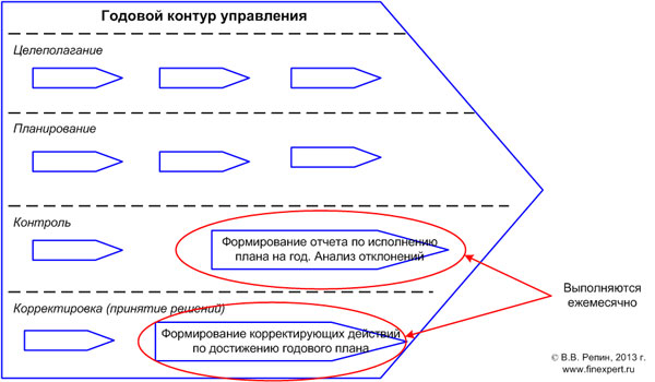 ого периода другого масштаба. Так в случае годового контура управления в нем представлены процессы «Формирование отчета…» и «Формирование корректирующих действий…», которые выполняются ежемесячно (т.е. в рамках временного периода «месяц»). Эти процессы нужны для того, чтобы годовой контур управления представлял замкнутую систему (цикл) процессов управления. Сказанное иллюстрирует рис. 3.