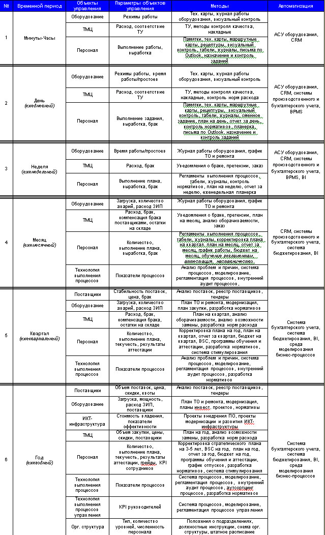 ом интервале «Минут-час» и «День» объектами управления являются оборудование, ТМЦ, персонал. Цель – выполнение деятельности и достижение запланированных результатов. В рамках этих временных периодов руководитель использует для управления: тех. карты, журналы работы оборудования, визуальный контроль, контроль соответствия ТУ, методы контроля качества ТМЦ, проверку правильности заполнения первичных документов (накладные), контроль норм расхода ТМЦ, табели, различные журналы, сменные задания, планы и отчеты за день, контроль нормативов, ежедневную планерку, отправку писем и контроль получения ответов по Outlook и проч. Однако процедуры (алгоритмы) выполнения процесса, различные требования и нормативы не являются объектами управления в рамках рассматриваемых временн