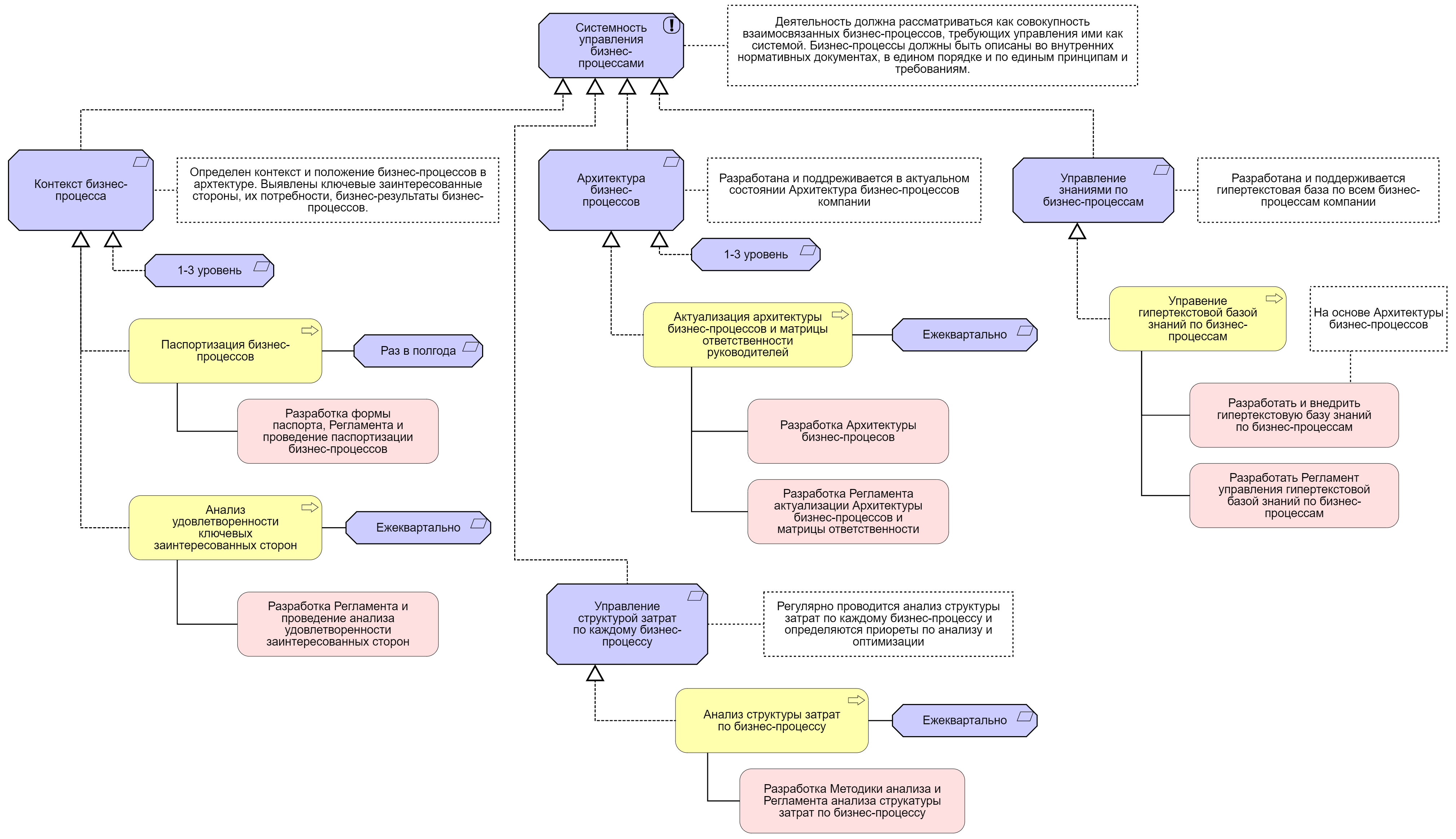 На рис. 1 представлен принцип системности управления бизнес-процессами. Данный принцип развертывается через три требования. Первое и, возможно, самое важное – это наличие в компании четко определенной и поддерживаемой в актуальном состоянии архитектуры бизнес-процессов. На рисунке показано само требование, комментарий к нему, дополнительное требование (в данном случае «1-3 уровень»), бизнес-процесс, который реализует требование, а также два мероприятия по внедрению (розовый цвет).