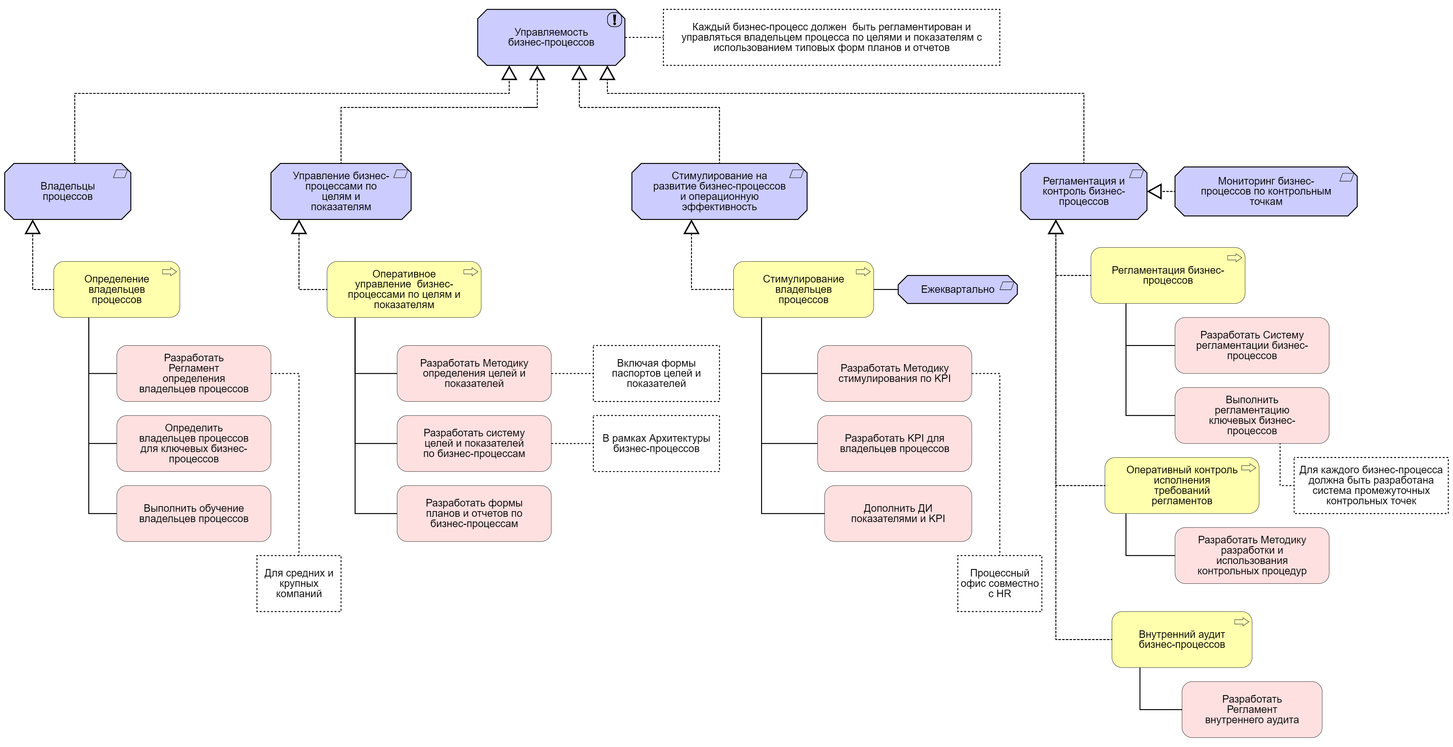 При внедрении системы управления бизнес-процессами реализация принципа управляемости означает, что нужно выбрать владельцев процессов, разработать для них регламенты, систему целей и показателей, систему материального стимулирования по KPI (включая доработку должностных инструкций), обучить их методам оперативного управления и анализа процессов с использованием показателей и контрольных процедур, выполнить регламентацию ключевых бизнес-процессов компании.