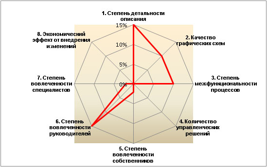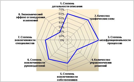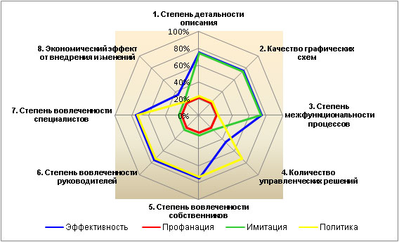 На рис. 6 показана ситуация с одним из проектов в крупной компании (экспертная оценка автора статьи). Процессное управление в ней внедряется уже третий год. В целом, ситуацию можно охарактеризовать как положительную. Разработано много детальных и качественных схем, которые использованы для анализа и регламентации деятельности сотрудников, в том числе при помощи web-портала (моделирования осуществляется в среде моделирования Business Studio 4.0).