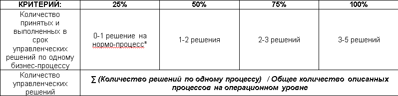 Но бывают ситуации, когда руководители вовлечены в проект. Совещания проходят эффективно. Схемы процессов позволяют подготавливать и принимать управленческие решения. Если это не так, то ценность разработки графических схем в конкретном проекте низкая. Регулярно принимаемые управленческие решения в рамках проекта внедрения процессного управления (и любого другого, кстати) означают, что в организации создана система работы, позволяющая надеяться на положительный результат. Обратим внимание, что решения должны быть не просто приняты, но и выполнены. Поэтому шкала для критерия количества управленческих решений может выглядеть следующим образом: