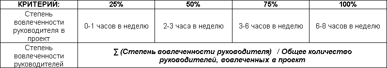 Если руководители не участвуют в проекте, то он заведомо обречен на неудачу. Поэтому критерий вовлеченности является очень важным. Оценку степени вовлеченности руководителей можно выполнить на основании следующей шкалы: