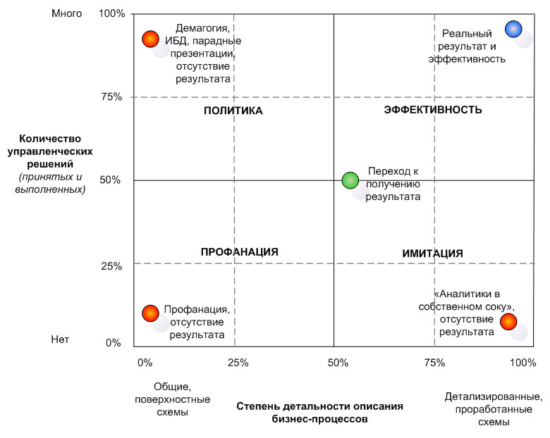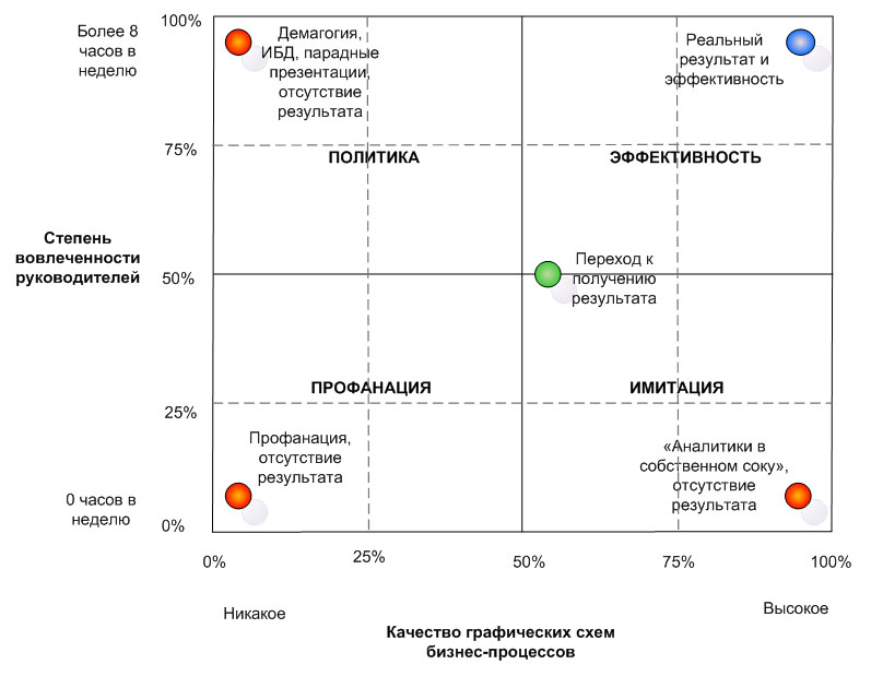 Бывает и так, что ни совещаний, ни детальных схем. Просто руководитель проекта ставит галочки по выполнению пунктов плана, а через какое-то время у компании появляются регламенты, «соответствующие» требованиям международных стандартов («исотизированные»). Но практическая ценность таких стандартов нулевая, если не отрицательная. На рис. 1. такая ситуация характеризуется термином «профанация». Результата для бизнеса, конечно же, нет.