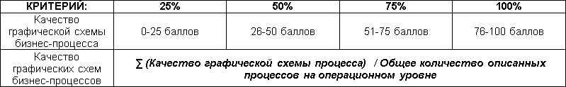 Второй критерий – это качество графических схем бизнес-процессов. Оценить его гораздо сложнее. В данном случае не обойтись без экспертной оценки. Но для того, чтобы сделать эту оценку менее субъективной, можно ввести ряд параметров оценки качества графической схемы бизнес-процесса, например: