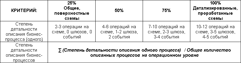 Детальность описания процесса является достаточно объективным критерием. Можно предложить следующую шкалу и формулу для его измерения: