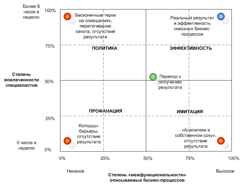 Наконец, в случае, если вам удалось вовлечь сотрудников подразделений в обсуждение и решение проблем на межфункциональном уровне (четвертый квадрант «Эффективность»), вы не далеки от практически важного для бизнеса результата.