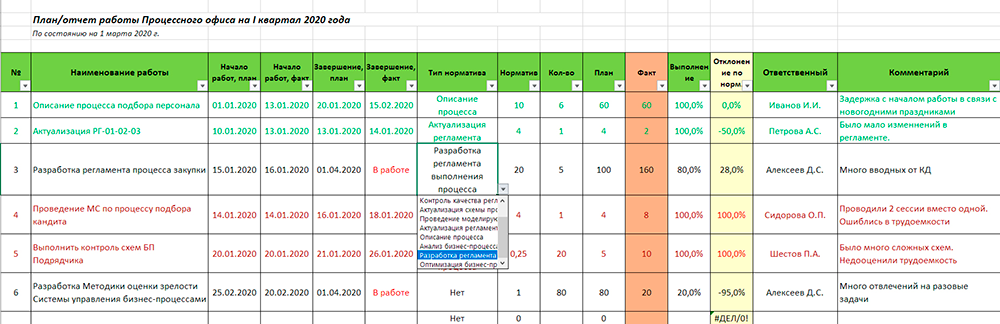 Рис. 1. Форма Плана/отчета работы Процессного офиса. Пример.