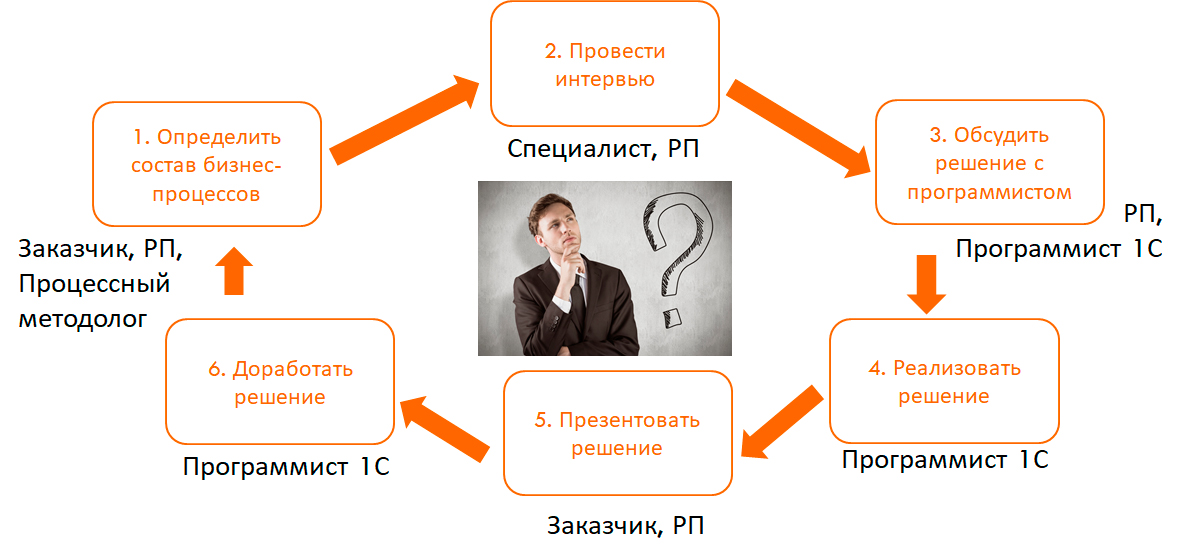 Бизнес-заказчик (руководитель компании, руководитель управления) определяет приоритетные процессы для автоматизации, например, создание и проверка нового контрагента, согласование и подписание договоров, управление входящими и исходящими документами, выпуск приказов и СЗ и проч. Далее руководитель проекта внедрения 1С-ДО проводит ряд встреч (интервью) с руководителями и специалистами, фиксирует требования (в Word, Excel) и дает задание на разработку программисту 1С. После разработки решения проводится его презентация заказчику и последующая доработка. Ключевым минусом такого подхода является то, что бизнес-процессов в целом никто не видит. У каждого – свое представление относительно того, как должен «работать» процесс. Что-то делается в 1С, но в целом картина не ясна.