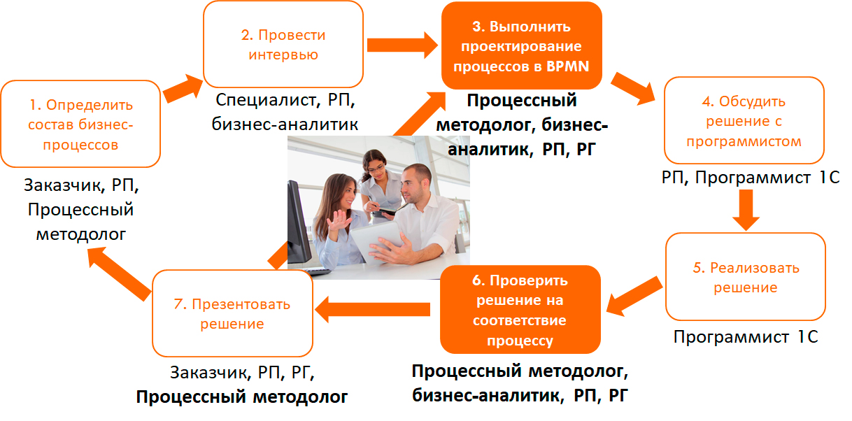 Создавались рабочие группы по соответствующим процессам. После проведения интервью бизнес-аналитик проектировал процессы в нотации BPMN в Business Studio с использованием четкого методического подхода, в том числе на схемах показывали потоки документов со статусами и проч. После этого схему(ы) распечатывали и обсуждали на совещаниях рабочей группы с участием руководителя проекта (РП) внедрения 1С.