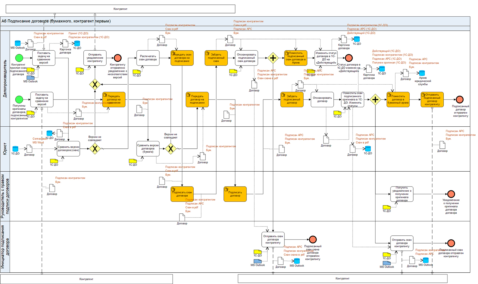 Для того, чтобы сделать модели процессов наглядными и понятными для руководителей и специалистов мы используем статусы документов. На рис. 5 показан пример схемы процесса подписания договора в бумажном виде для случая, когда первым подписывает контрагент. Для ускорения процессов в компании было принято решение работать с поставщиками по сканам договоров. Такой формат требует четкой организации и закрепления ответственности. Кстати, задачи, связанные с ручной передачей документов показаны на рис. 5 оранжевым цветом с маркером «ладошки».