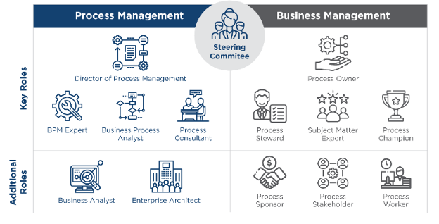 Вместе с организационной структурой, модель управления и должности создают основу для использования всего процессного потенциала и управления процессами с учетом принципов ответственности, спонсорства и контроля. Согласно исследованиям APQC, наиболее эффективная структура управления бизнес-процессами предполагает наличие специализированного отдела BPM, отдельных должностей по управлению процессами в каждом бизнес-подразделении, а также управляющий комитет, который помогает согласовывать роли и подходы между всеми участниками. Такая организация позволяет наилучшим образом оптимизировать бизнес-процессы в компании.