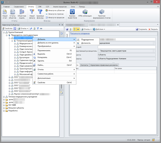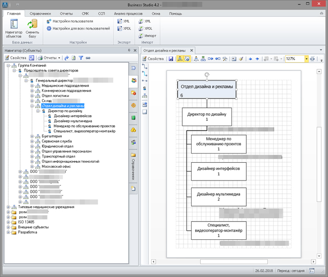 В среде моделирования Business Studio для добавления организаций, подразделений и должностных позиций используется раздел “Навигатор (Субъекты)”, позволяющий сформировать иерархию юридических лиц, подразделений и должностей.