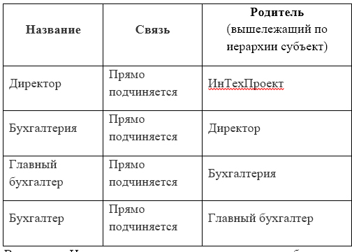 Также для формирования иерархии субъектов необходима таблица с указанием родителей и связей. А именно: для построения иерархии следующего вида: