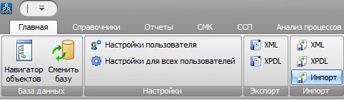 Для того, чтобы выполнить импорт, нужно нажать одноименную кнопку в панели инструментов среды Business Studio.