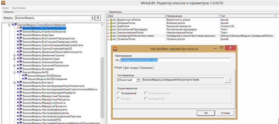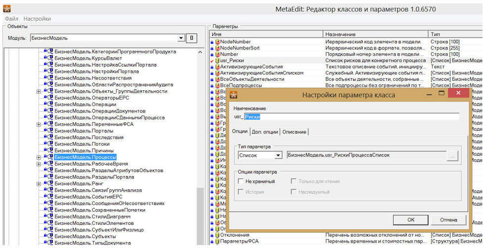 Для класса «Процессы» создан новый атрибут «Риски» - список рисков для процесса.