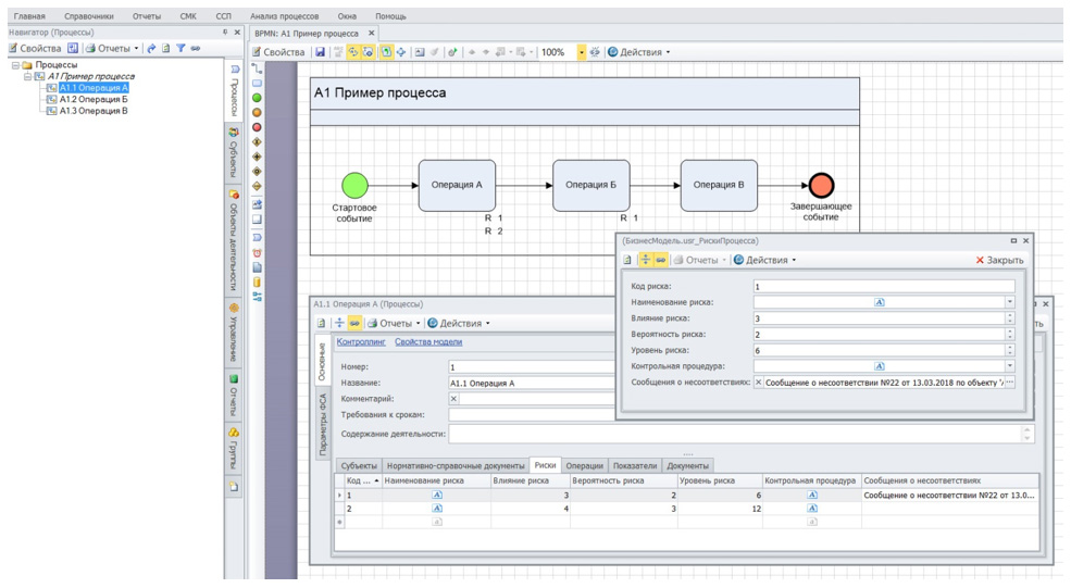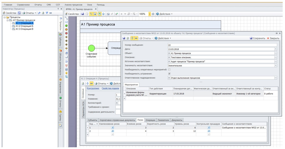 В Business Studio существует справочник «Сообщения о несоответствия» (см. цитату из руководства ниже). Для каждого сообщения о несоответствии может быть создано несколько мероприятий с указанием типа мероприятия, сроков (план, факт), ответственных и т.п. Вследствие архитектуры Business Studio привязать список мероприятий напрямую к конкретному риску процесса нельзя. Но можно привязать конкретное сообщение о несоответствии, для которого указать перечень мероприятий.