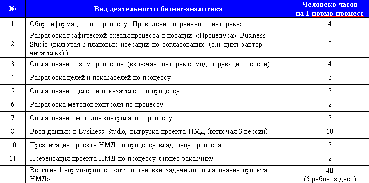 Таблица 1. Нормативы деятельности бизнес-аналитиков
